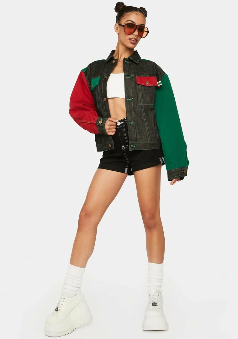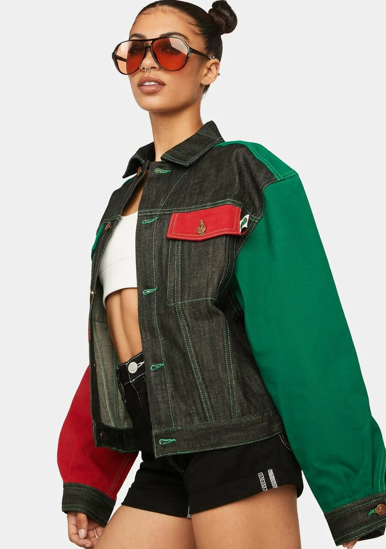 make way for the style icon. This denim jacket has an oversized, boxy fit, a colorblock design, two breast pockets, an embroidered brand logo patch at the back, and button closures down the front.