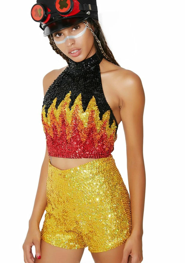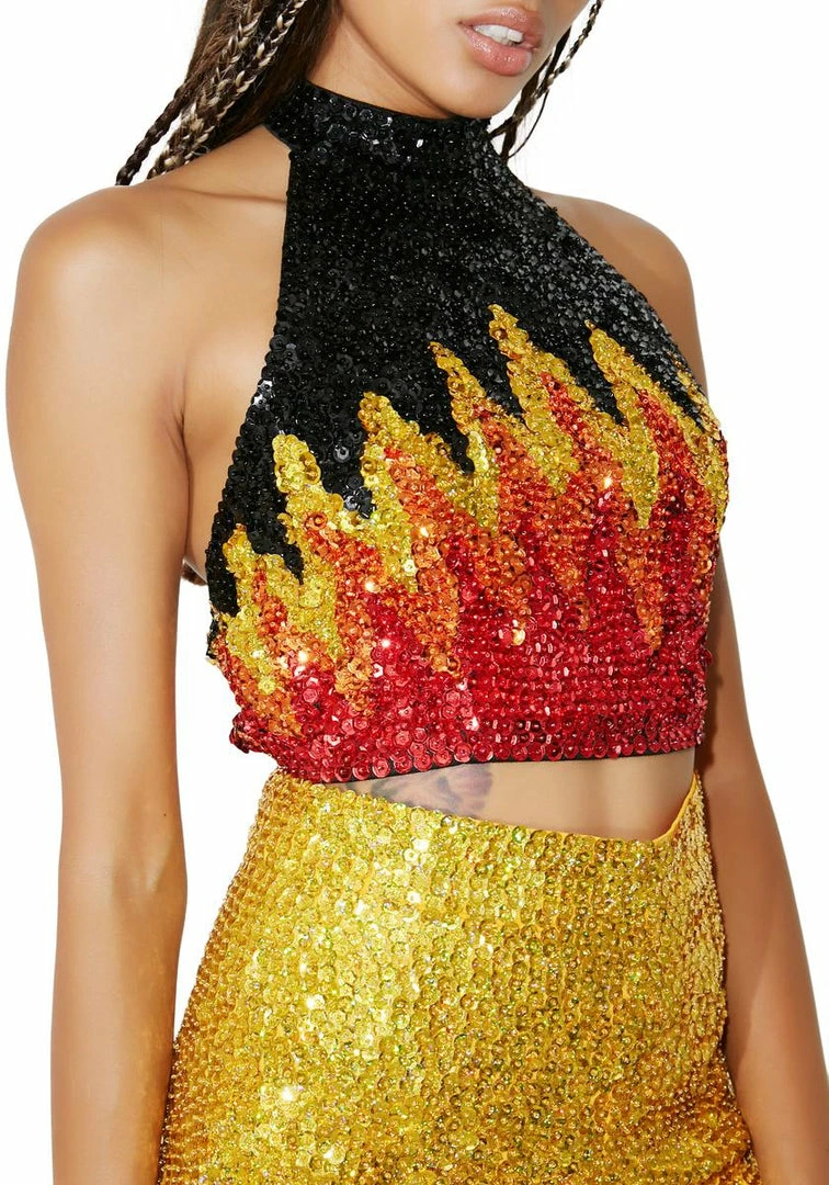 if ya play with fire ur gonna get burned…this smokinâ sequin top has a halter neckline with velcro closure and adjustable bra hook closure.