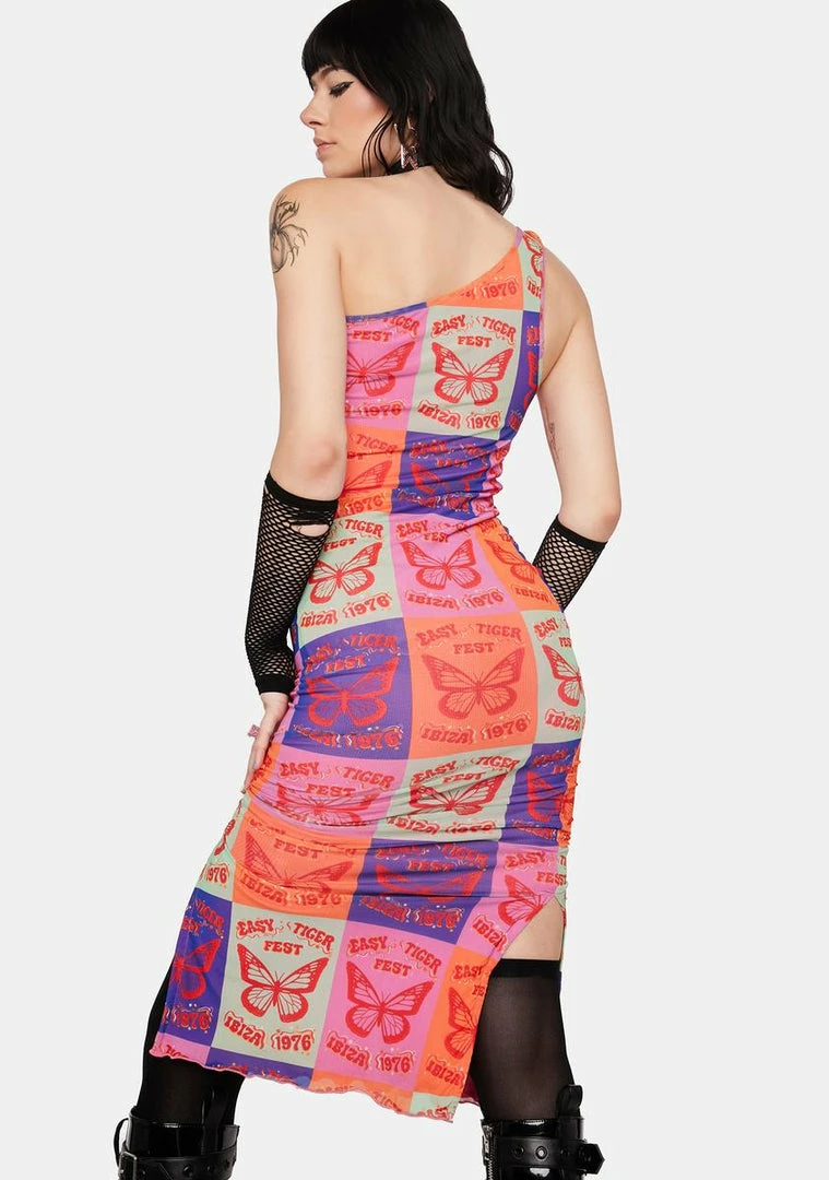cuz island living is calling. This midi dress has a vibrant ’60s-inspired patchwork print, a one shoulder construction, a side slit at the hemline, and lettuce trim.