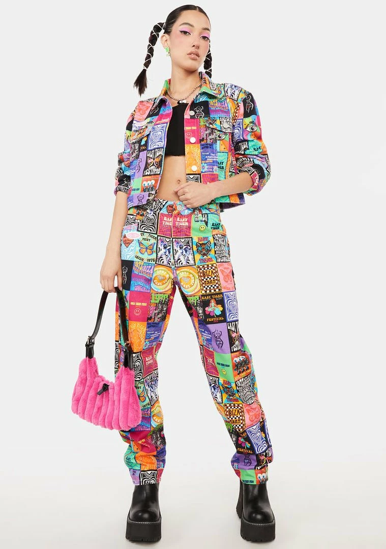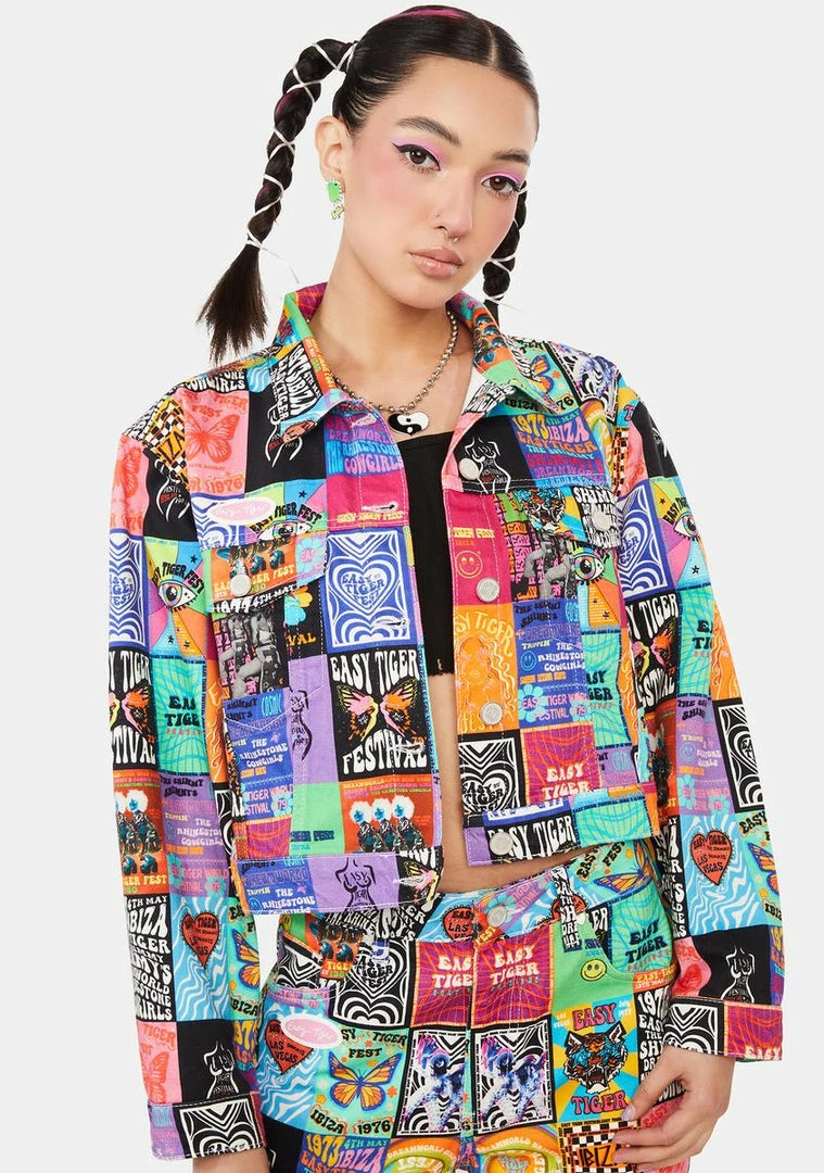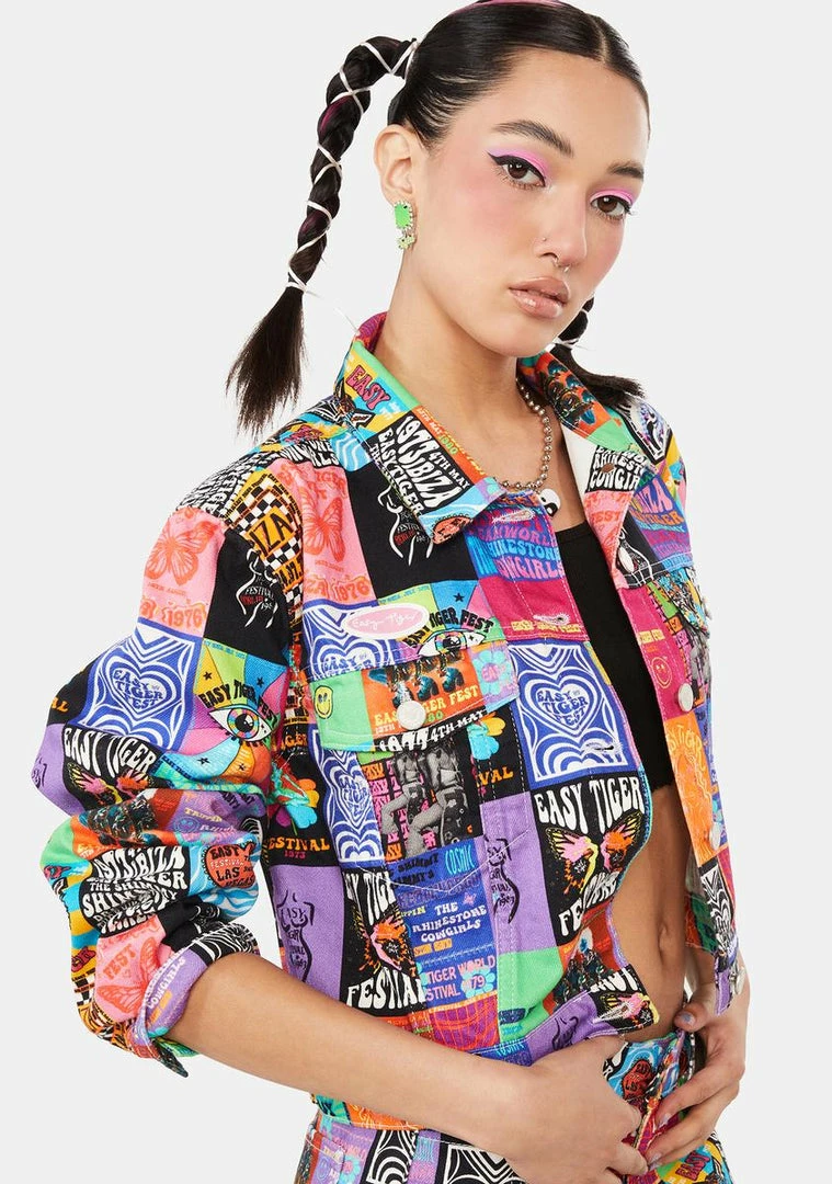 cuz you’ll never stop dreaming! This retro denim jacket has a patchwork print all over inspired by decades of festival posters, a collar detail, and front button closures.