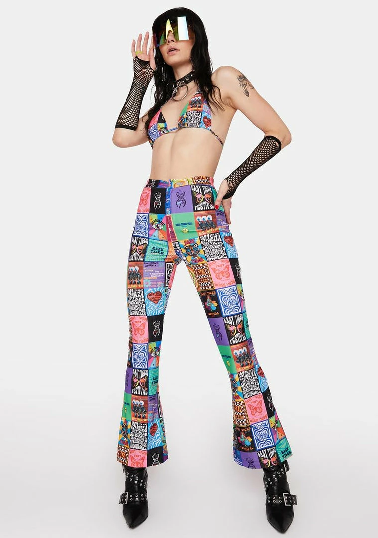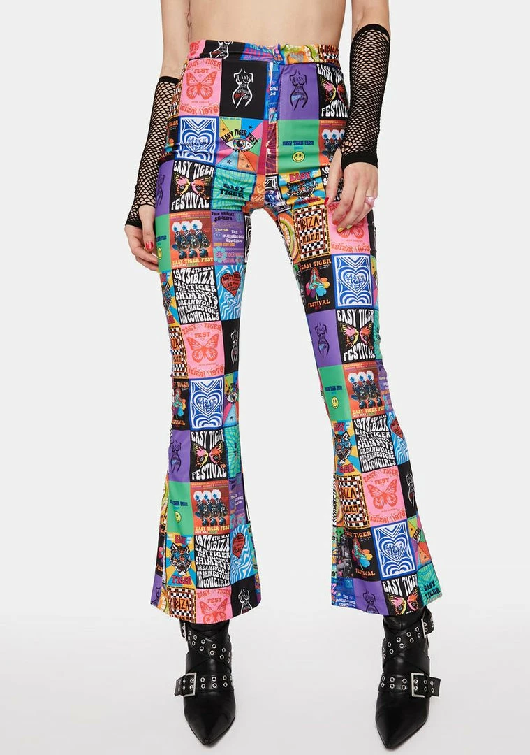 got you feelin’ the love. These high-waisted pants have a vibrant ’60s-inspired patchwork print, figure-hugging stretchy fabrication, a zipper closure, and cropped flared legs.