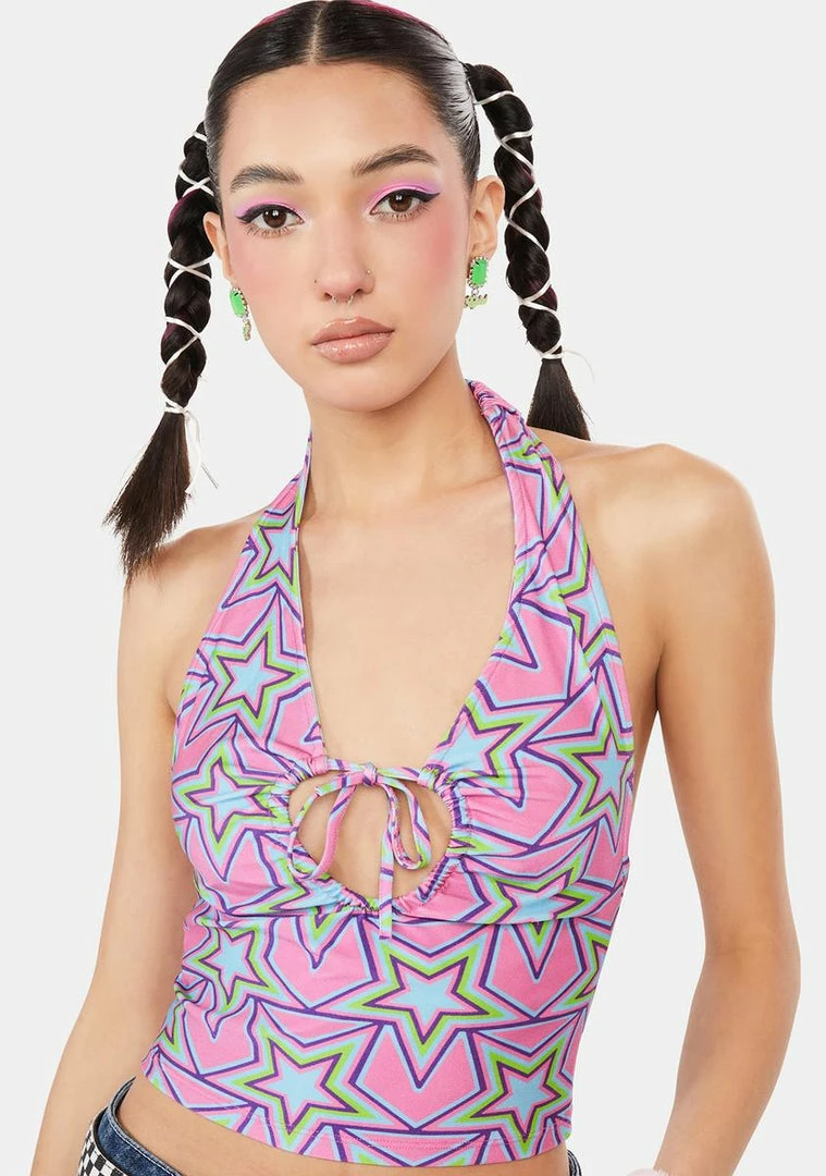 cuz you leave them in a trance! This super stretchy halter top has a plunging neckline with a tie front detail, a slightly cropped fit, and a trippy star print all over.