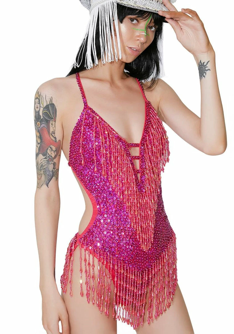 get that fringe a-flyinâ babe! This sparkly holographic sequin bodysuit has beaded fringe, cut-out front detail with adjustable ties and side hook closures.