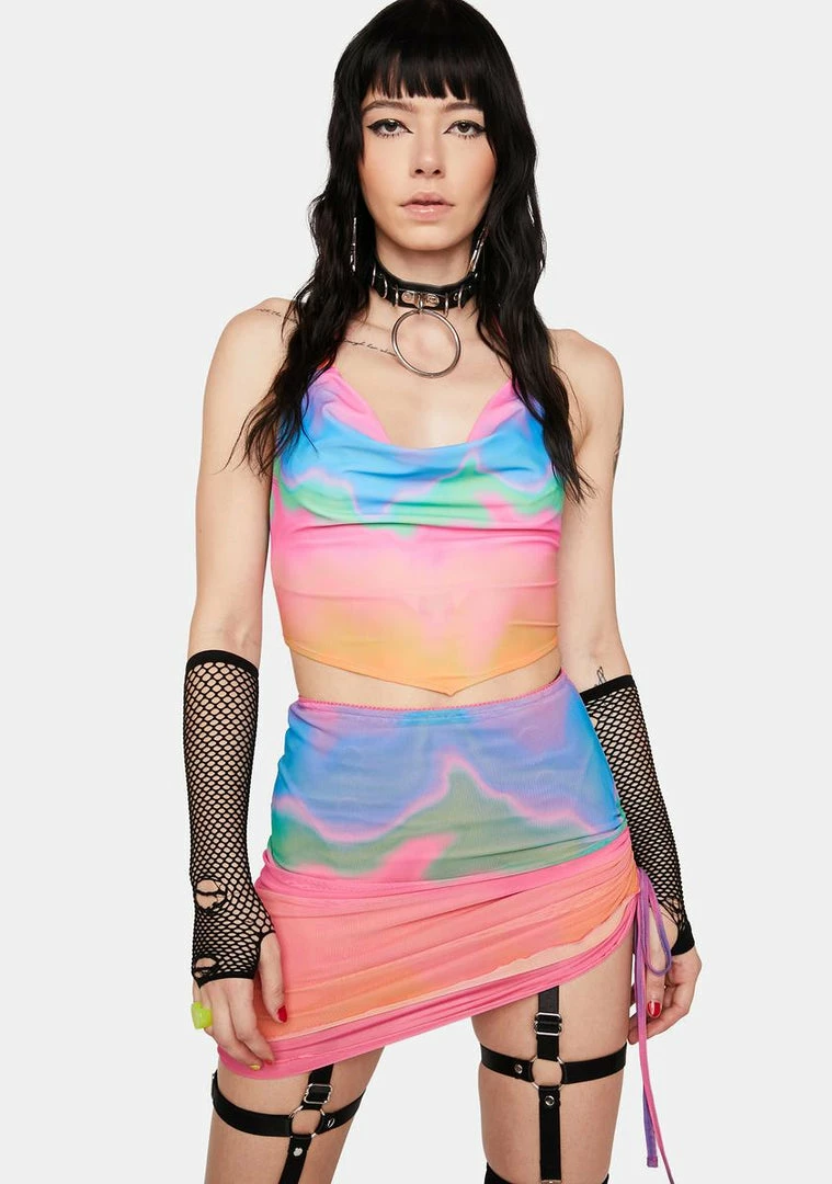 for another new beginning. This high-waisted mini skirt features a dreamy sunrise print, a cinched detail at the side with adjustable ties, and a stretchy double-layered mesh fabrication.