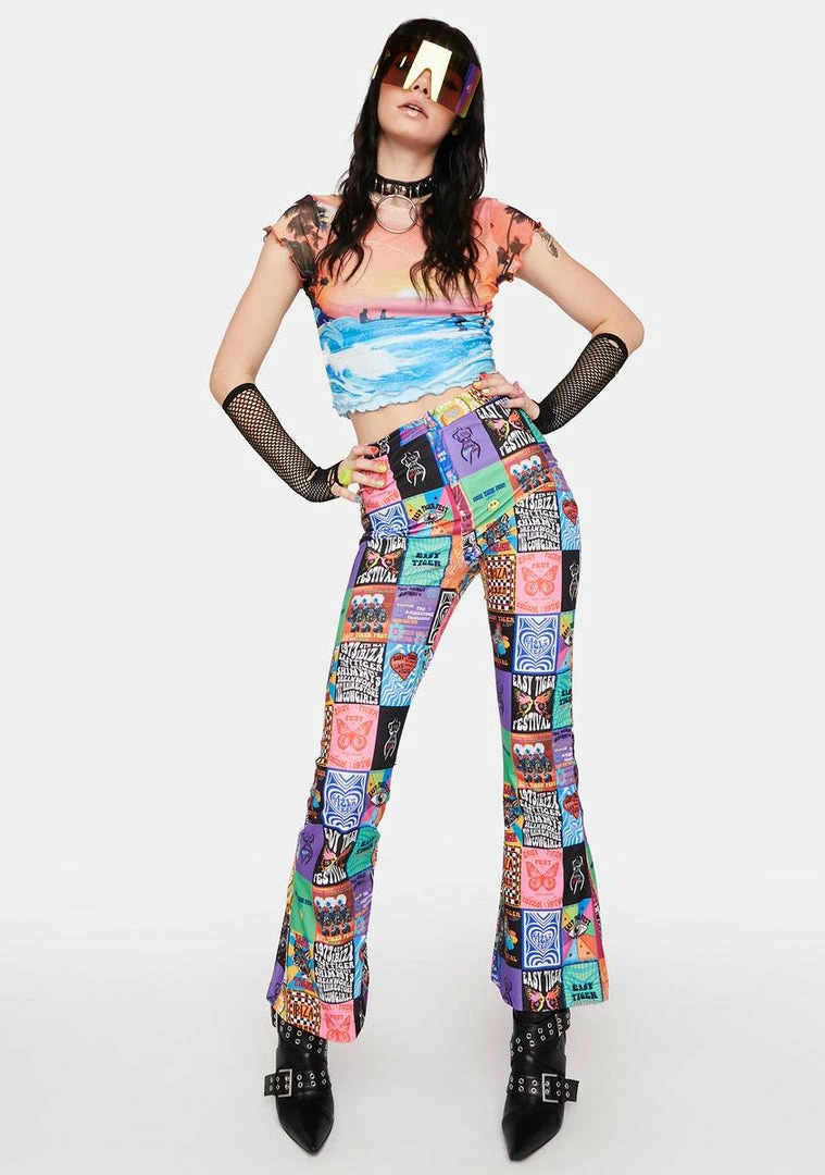 cuz the sky speaks in colors. This cropped tee features a divine sunset print with graphics of surfers and palm trees, a double-layered mesh fabrication, and lettuce trim.