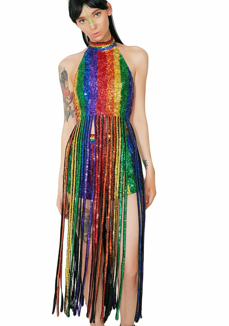 ur gettinâ the fringe a-flyinâ! This supa sparkly sequin top has long fringe trim, halter neckline with velcro closure and adjustable bra hook closure.