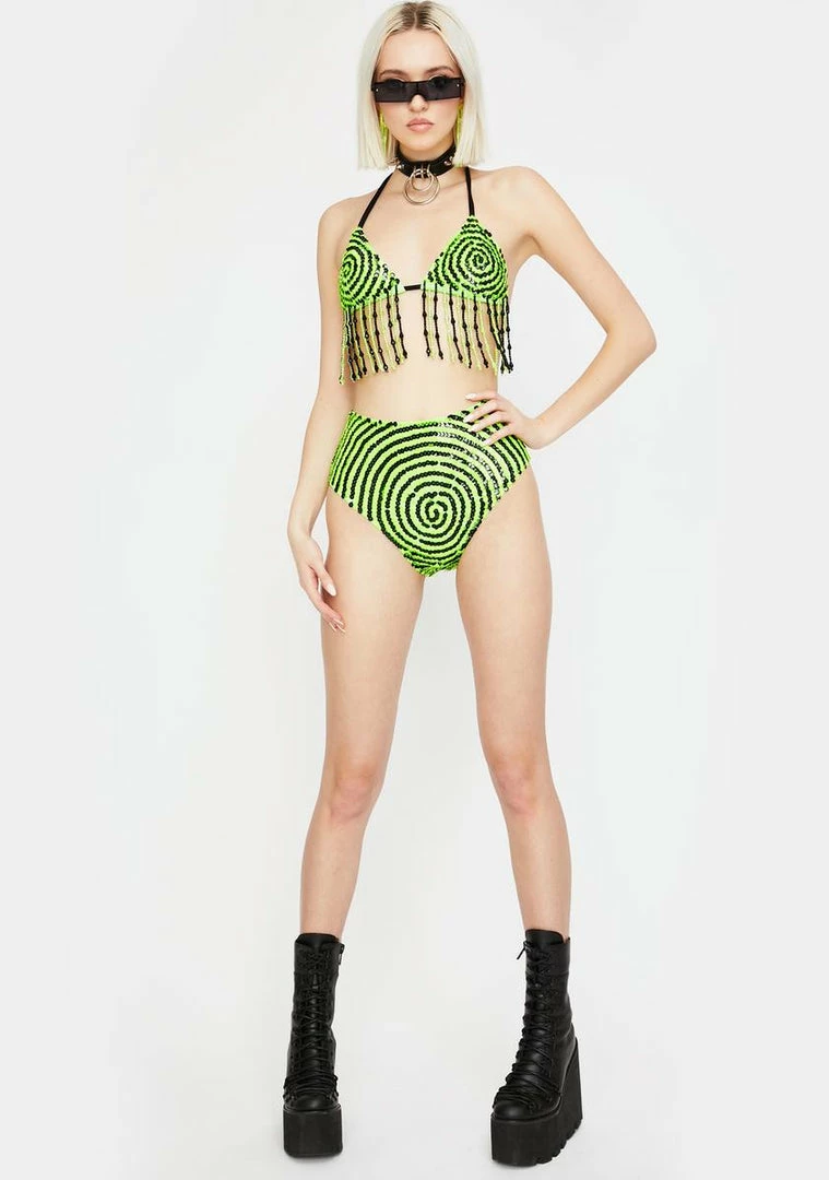 cuz yer traveling far into wonderland! Go deeper than the music in this neon bright sequin bra top that has a trippy hand beaded fringe construction, adjustable cups Nâ double back tie closures.