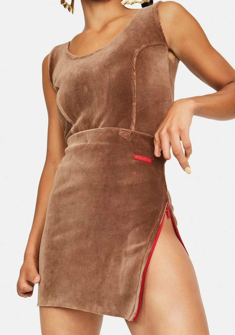 you’re servin’ sass and class. This mini skirt has a soft ribbed construction, an elastic waistband, and thigh high side splits with contrast zippers.