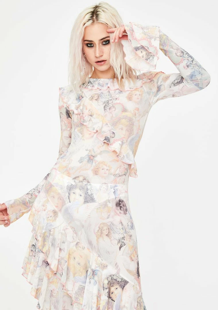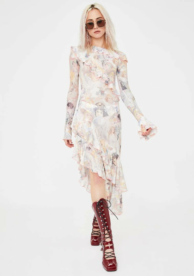 cuz you make it feel like heaven to âem. Stay high on cloud nine in this semi-sheer maxi dress that has long sleeves, ruffled trim, an asymmetric hemline Nâ a cherub print all ova.