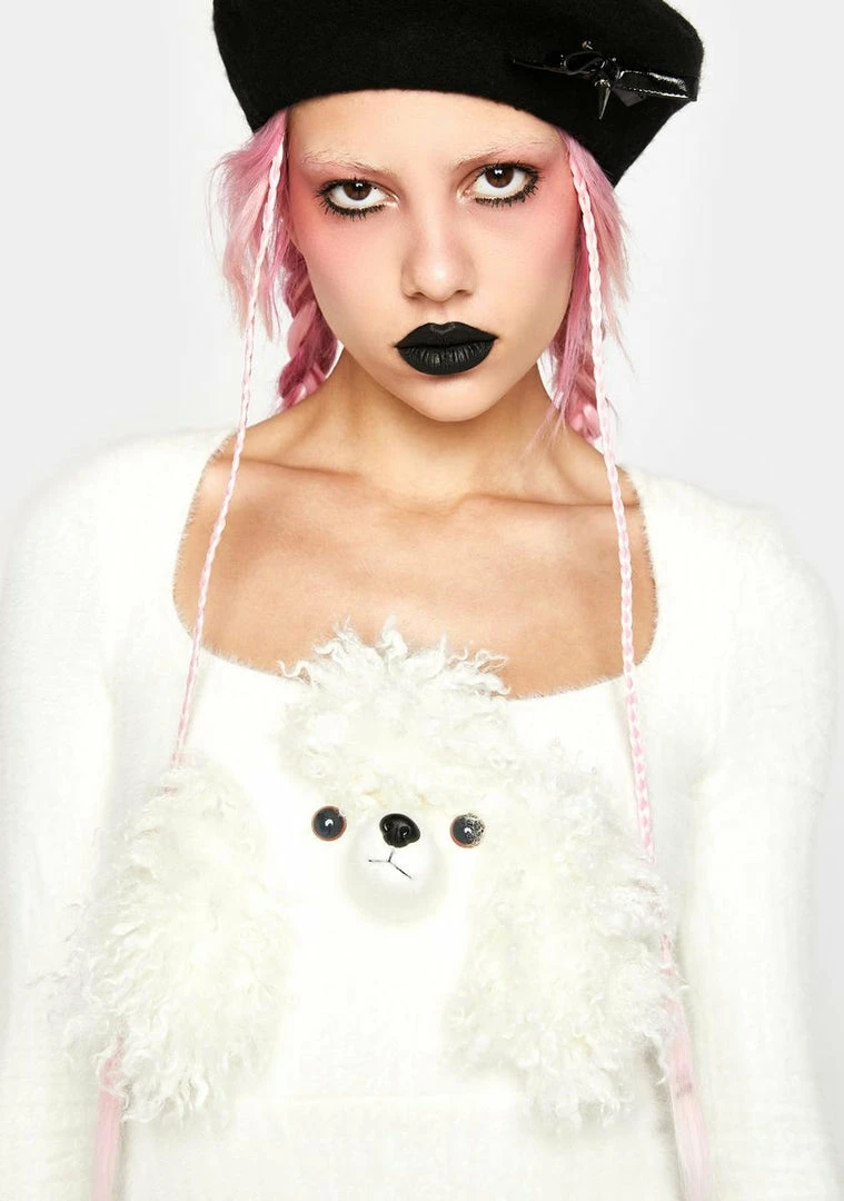 cuz you’re ruff and ready. This mini dress has a soft-touch faux fur construction, a 3D poodle applique at front, jersey lining, and long sleeves with finger holes.