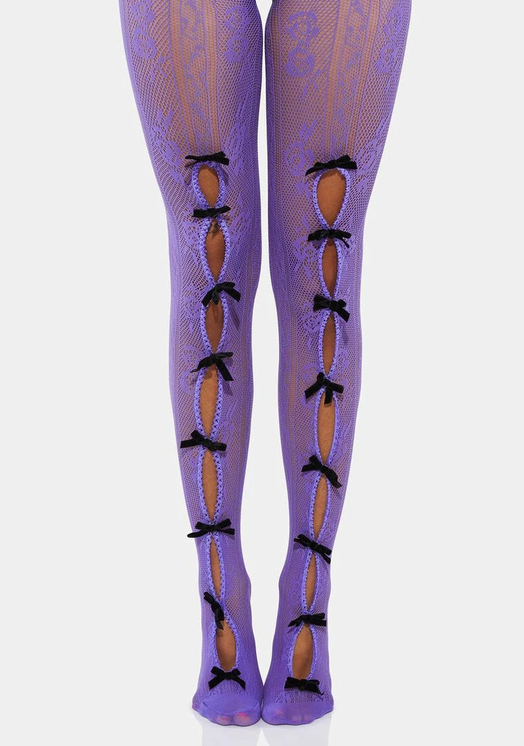 have a fishnet construction, lace detailing, and black bows on the front.
