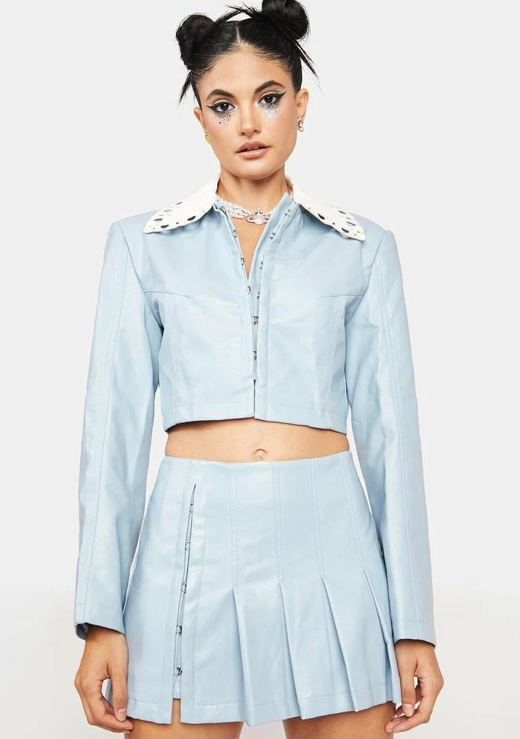 give ’em cutie vibes. This cropped vegan leather jacket has a contrast laser cut embroidered collar, long sleeves, and hook and eye closures on the front.