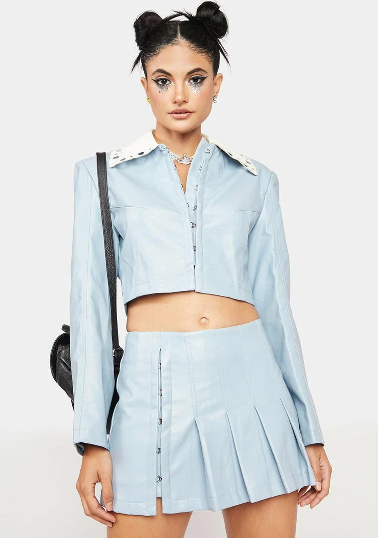 give âem cutie vibes. This pleated mini skirt has a vegan leather construction, a high waist fit, and hook and eye closures on the front.