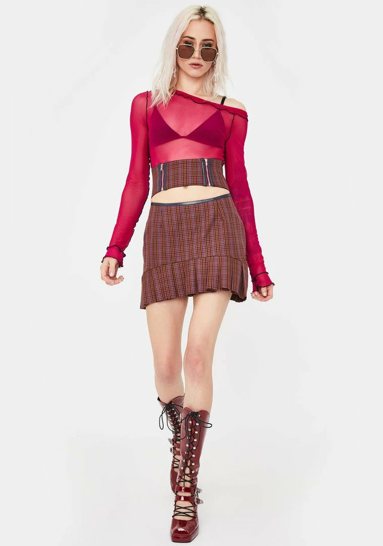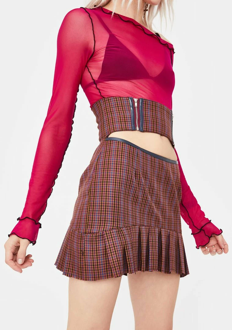 got ya lookin fresh off tha runway, babe! Stunt on the scene in this high wais wool mini skirt thatâs got a cut out across the waist, a ruffled hem and checkered print all over.