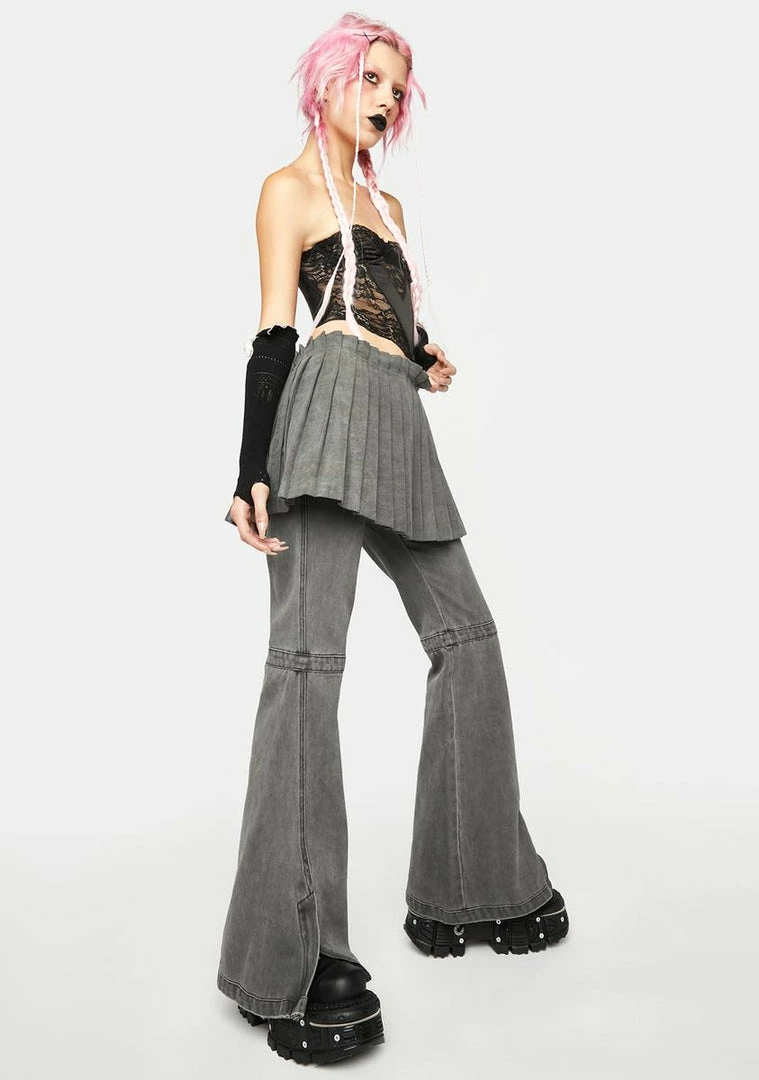 cuz baddies never rest. This set includes a detachable pleated mini skirt, matching jeans that have a flared silhouette, zipper detailing on the pants leg, a low rise fit, and a button and zip closure.