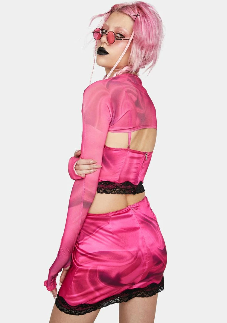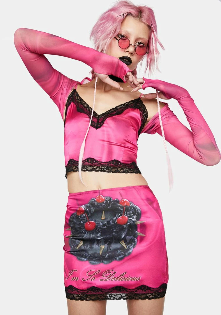 cuz you’re all set for a great day. Look amazing in this mini skirt that has an all over rose print, a black cake graphic with the words “I’m so delicious” on the front, a lace trim, a low waist fit, and a back zip closure.