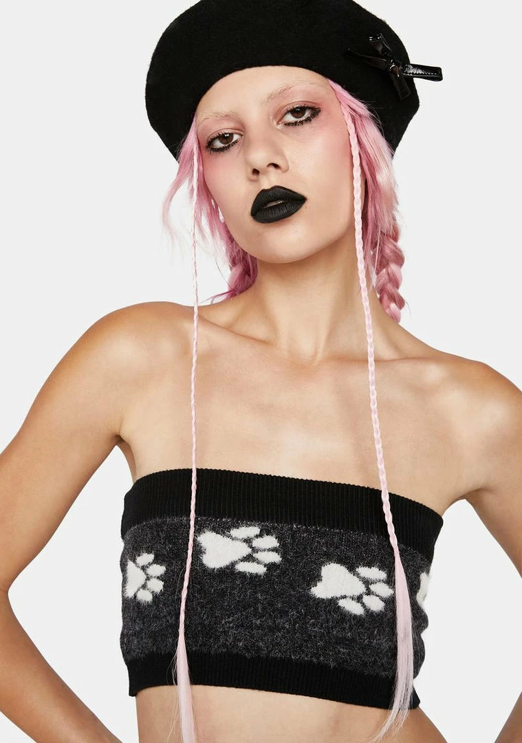 mark your territory. This tube top comes in a fur knit construction, with ribbed trim details, and paw print details.