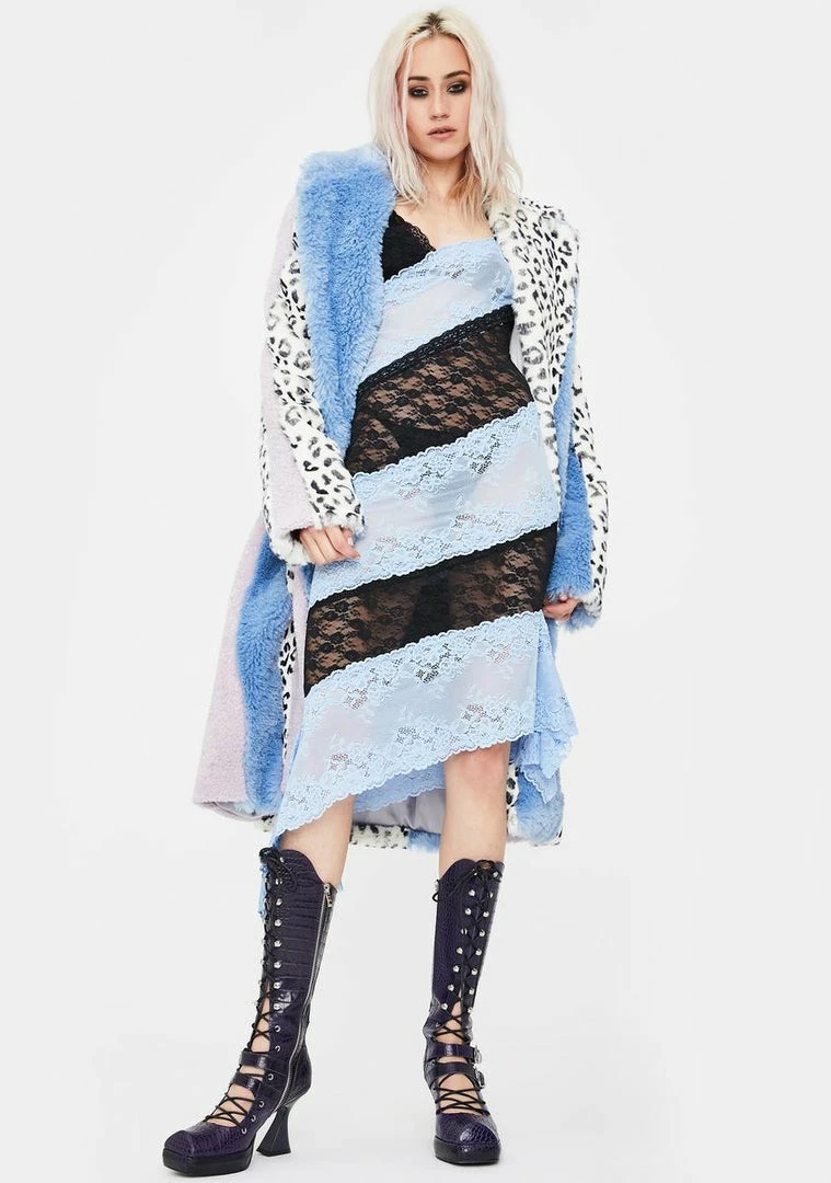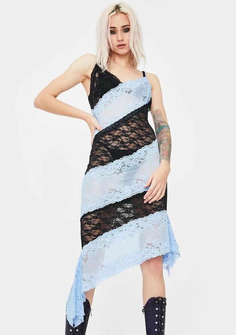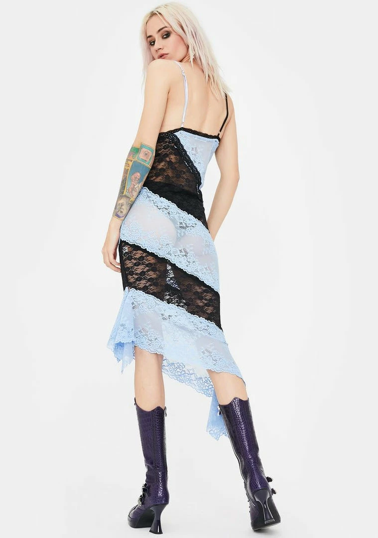 cuz you always get what you want, bb! Get yer flirt on in this saucy slip dress that has sheer lace construction with a patchwork design, thin cami straps, a low back, and an asymmetrical hemline.