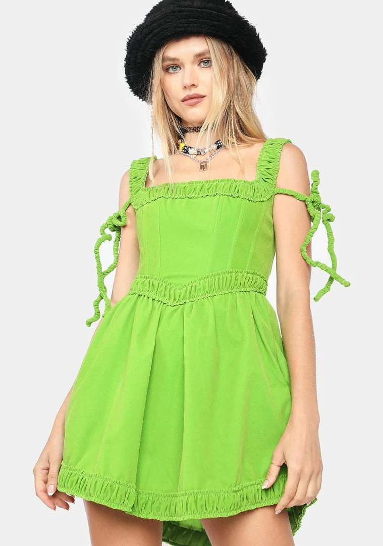 features a soft velvet construction, a square neckline, off-the-shoulder tie straps, ruffled trim details, and a side zipper closure.