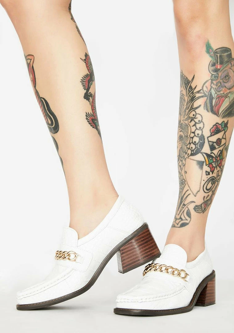 cuz youâve gotta a bank account bigger than yer ego, bb! Youâre a class act in these chic handmade loafers that have crocodile print leather construction, glitzy chain accents, and chunky block heels.