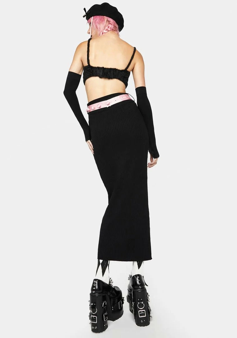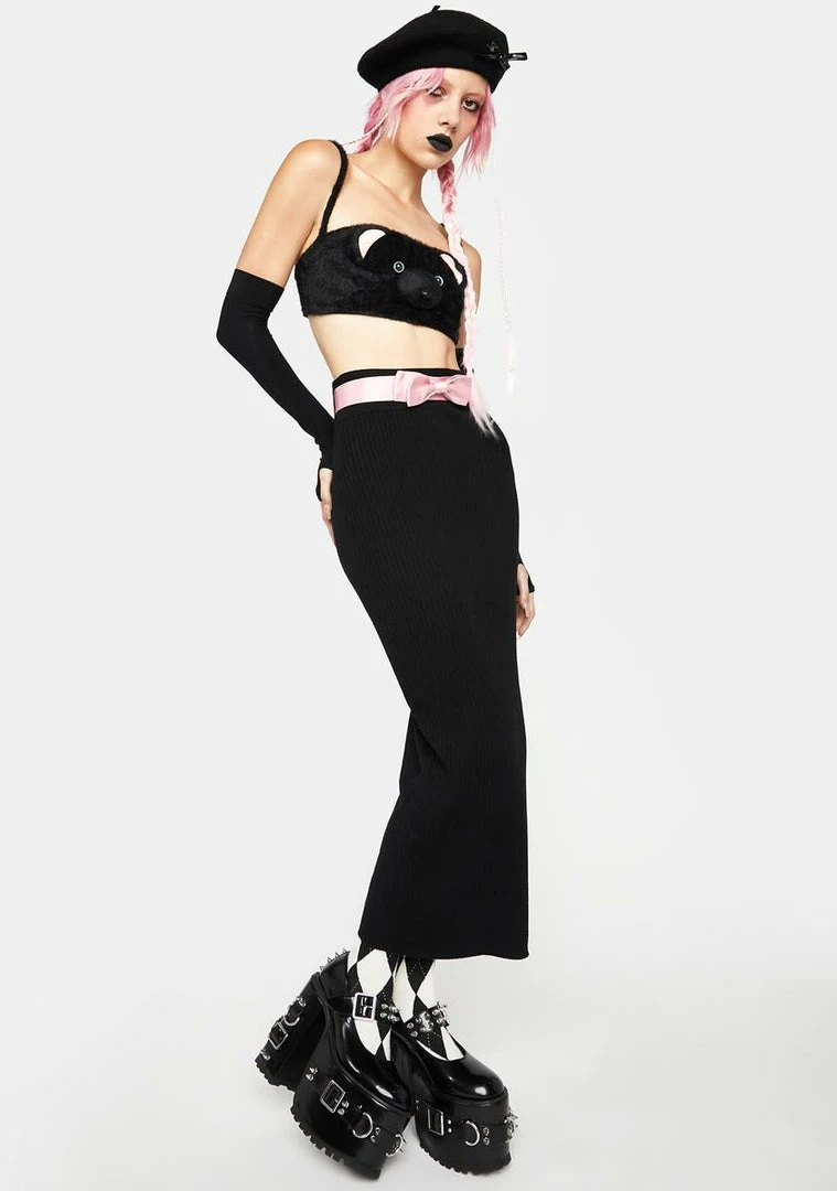 cuz you’re so chic. This midi skirt comes with a high waist, in a ribbed knit construction, with a contrasting belt and bow detail.