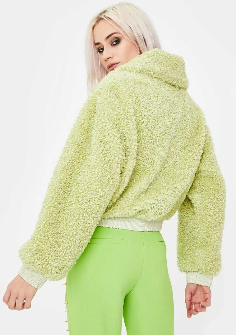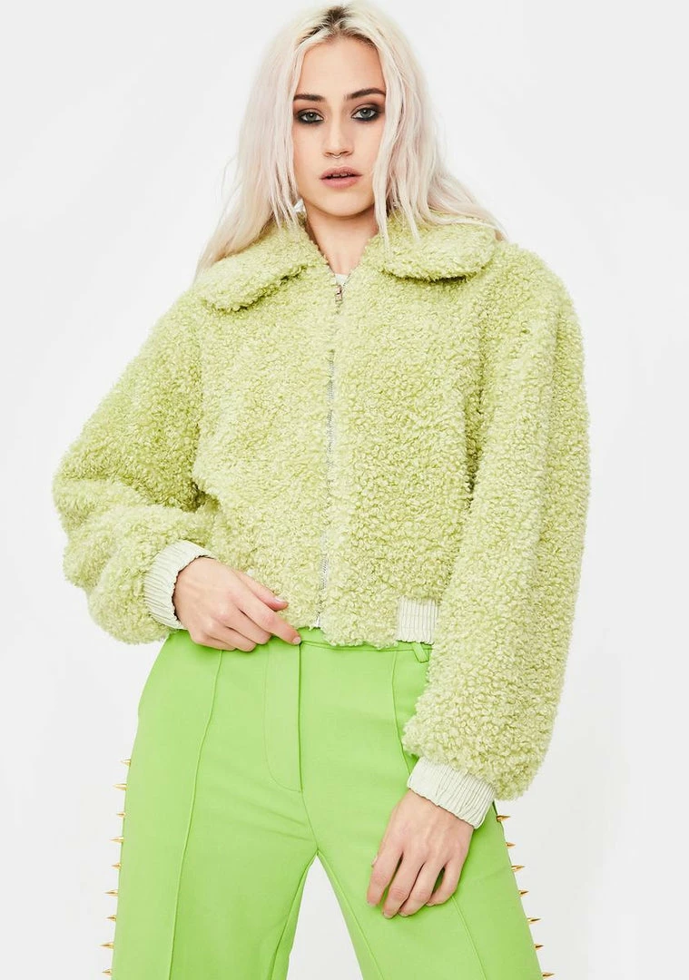 will give ya warm fuzzies! Fluff it up with this cozy cropped jacket that has soft sherpa construction, a fold over collar, ribbed cuffs, and a front zip closure.