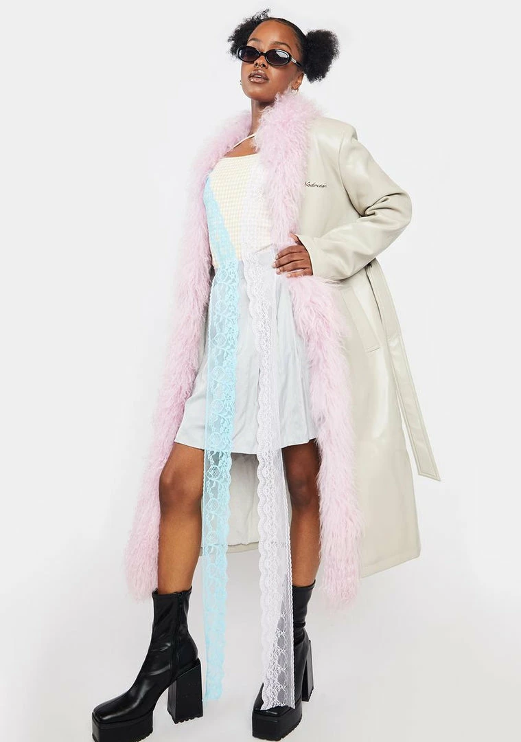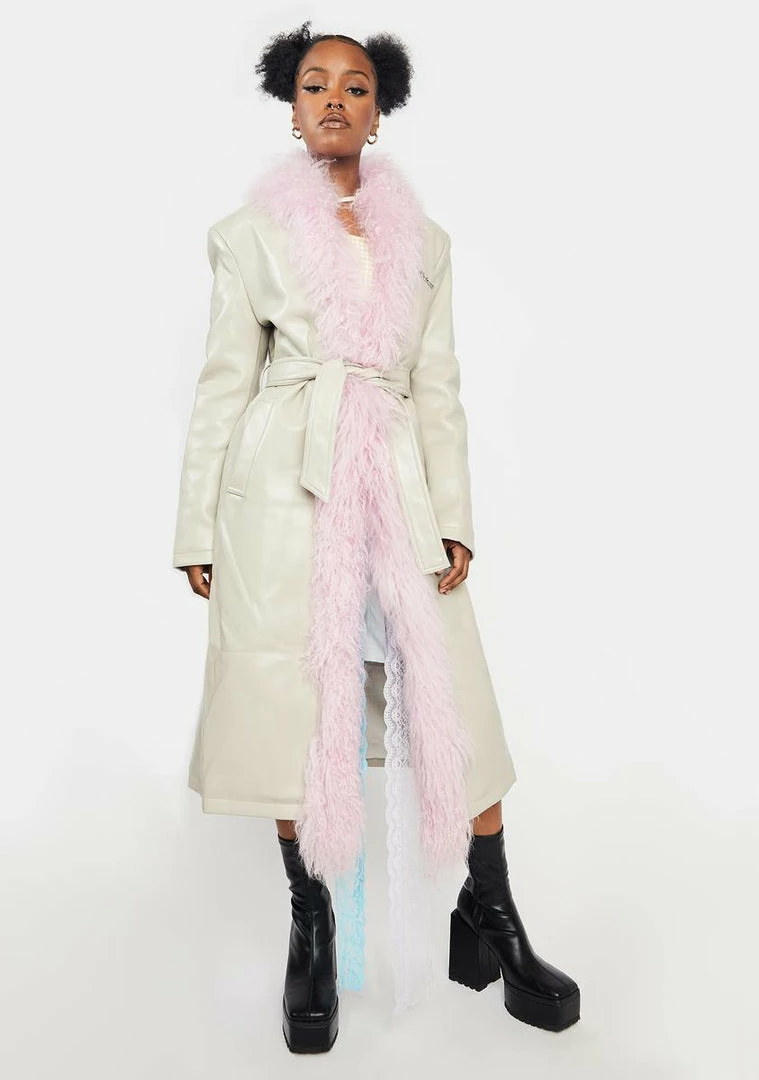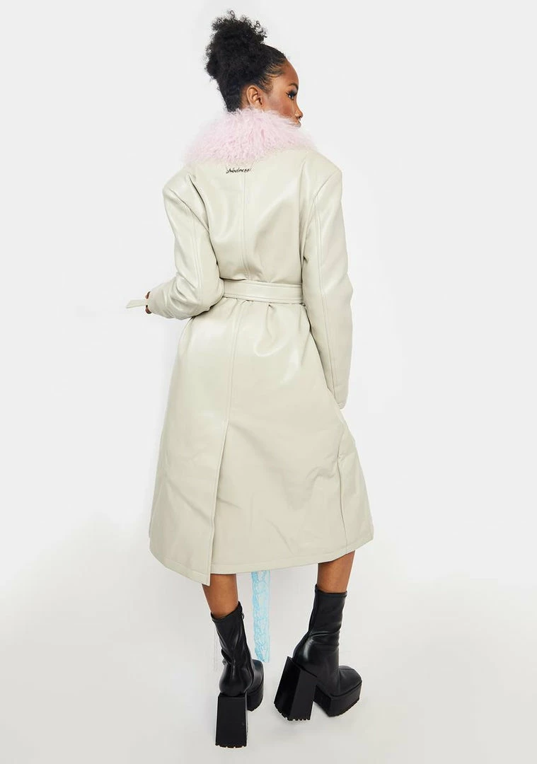 cuz youâre living the luxurious life. This genuine leather longline coat has mongolian fur trim, pockets on the sides, a waist tie belt, and enamel logo details on the front and back.