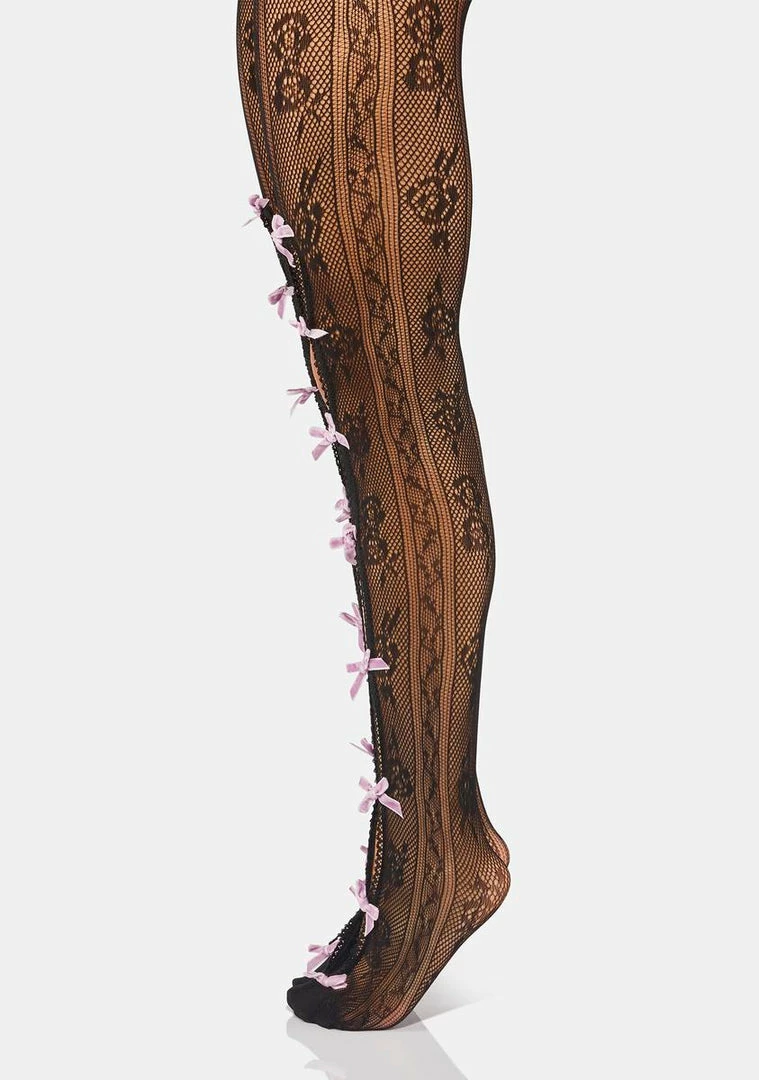 have a fishnet construction, lace detailing, and purple bows on the front.