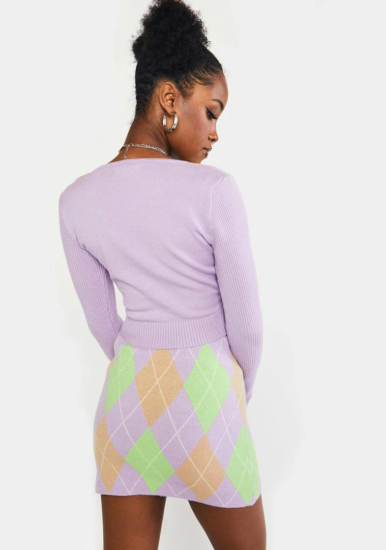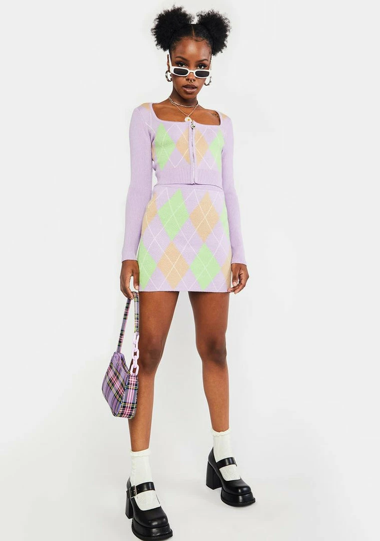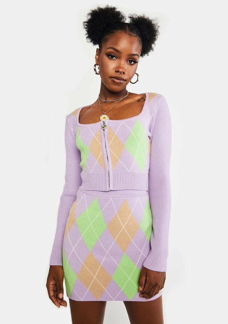 you’ve got class and sass. This ribbed knit cardigan top has a square neckline, a zip-up closure with a gem heart charm, and an argyle pattern on the front.