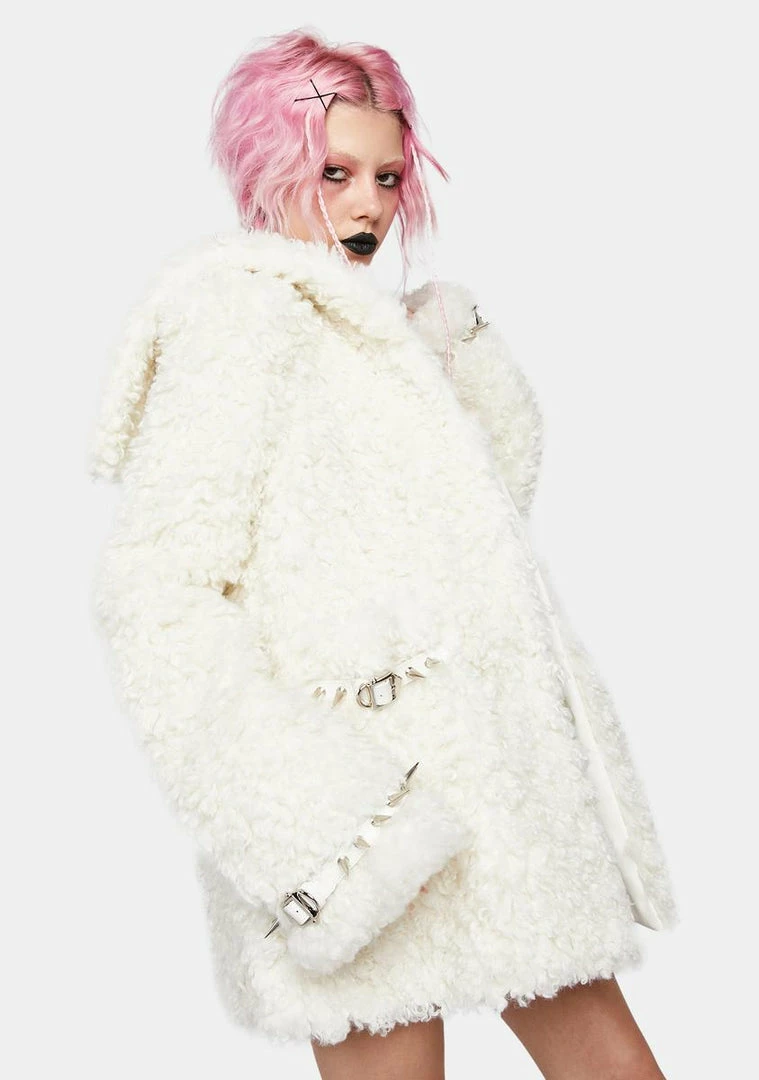 cuz you might bite. Be a sexy vamp with this coat that has a faux fur construction, a sailor collared neckline, long sleeves, spike detailing, pockets, and front clasp closures.