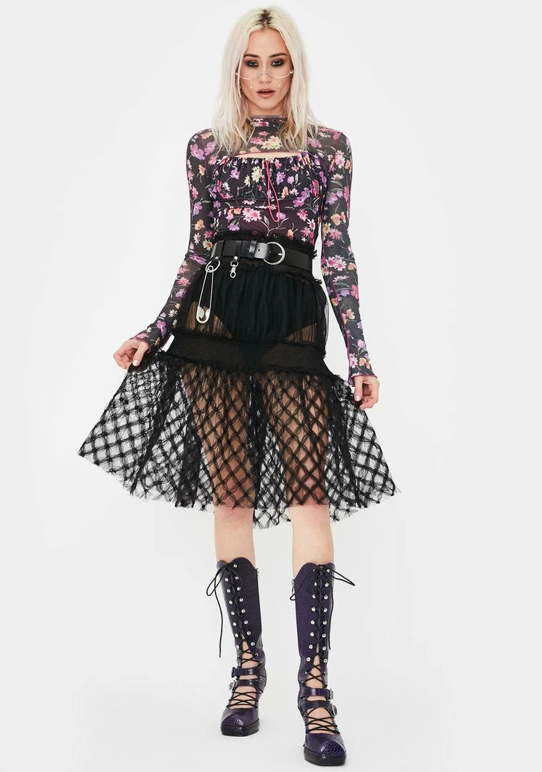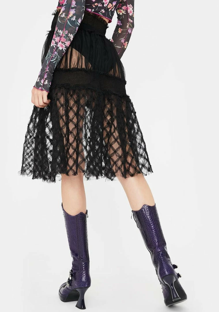 cuz youâre too glam to give a damn. Serve posh lewks in this saucy knee length skirt that has sheer mesh construction with a diamond pattern and an extra high waisted fit.