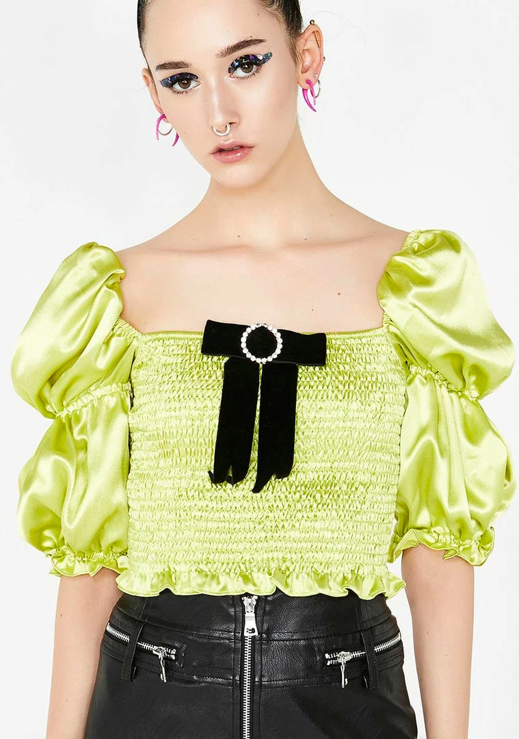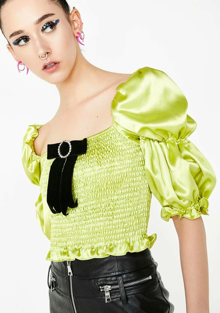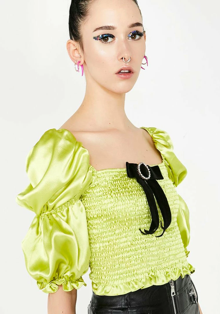 will have ya sittin’ in the lap of luxxxury. Fly first class in this elegant blouse that has a square neckline, puffy sleeves, a supa cute diamond studded bow, and ruffled hems.
