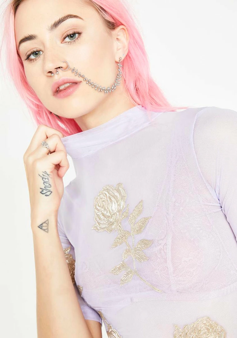cuz ya livinâ majorrr! Rock the new ish in this sikk sheer top that has a supa stretchy material, a mock neck, and embroidered florals all ova.