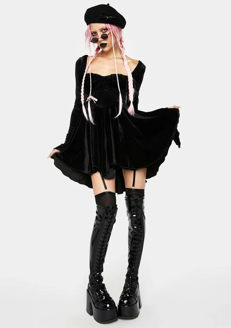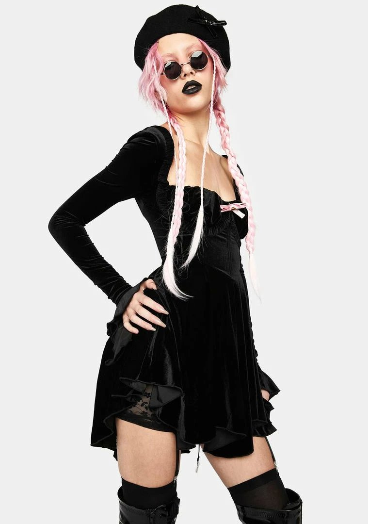 cuz you love to make an entrance. This mini dress has a soft-touch velvet construction, a detachable bow applique at front, a ruched detail at bust, a boned bodice, and a back zip closure.